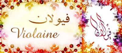 Mug avec le prénom "Violaine" écrit en français, en arabe (فيولان) et calligraphié de façon artistique en arabe sur la partie droite.