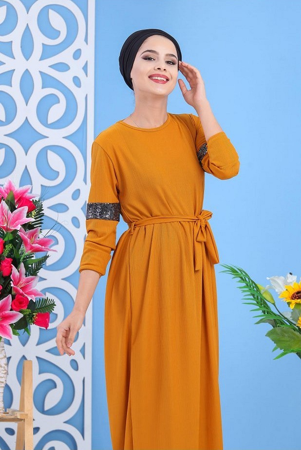Robe longue décontractée chic à strass pour femme - Couleur jaune moutarde Vetement & Accessoire