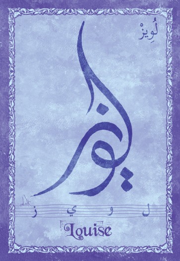 Jolie carte postale représentant le prénom français Louise calligraphié en arabe ainsi que son épellation lettre par lettre en arabe. Derrière la carte postale se trouve la signification du prénom. Prénom d'origine germanique signifiant illustre, combattante.