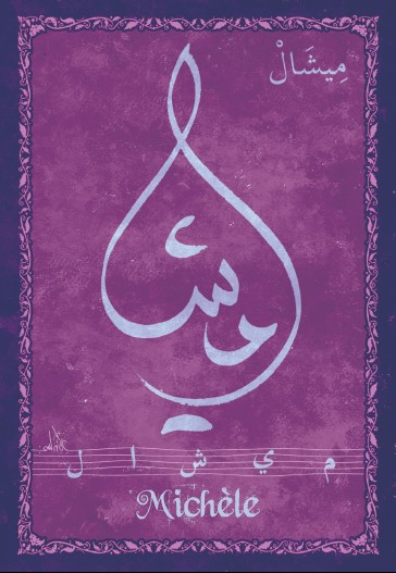 Jolie carte postale représentant le prénom français Michèle calligraphié en arabe ainsi que son épellation lettre par lettre en arabe. Derrière la carte postale se trouve la signification du prénom. Prénom d'origine hébreu signifiant proche de Dieu.