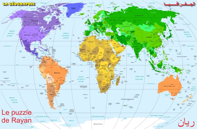 Puzzle détaillé de la carte du monde en couleurs avec le nom de tous les pays et de leur capitales ainsi que les grandes villes (en anglais).