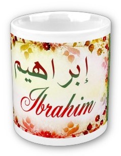 Mug avec le prénom masculin Ibrahim calligraphié en arabe (إبراهيم) ainsi que son épellation lettre par lettre en arabe.
