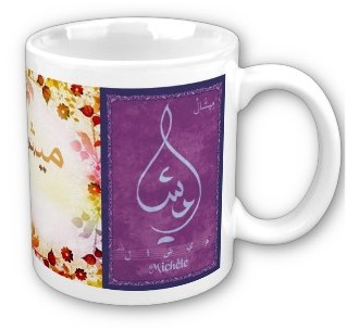 Mug avec le prénom "Michèle" calligraphié en arabe (ميشال) ainsi que son épellation lettre par lettre en arabe.