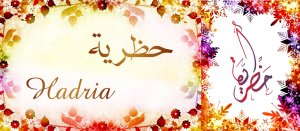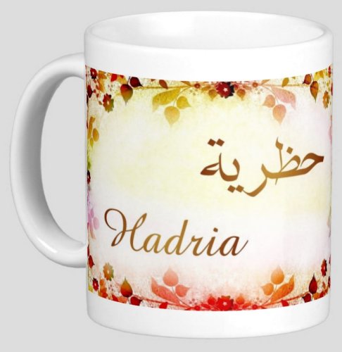 Mug avec le prénom "Hadria" écrit en français, en arabe (حظرية) et calligraphié de façon artistique en arabe sur la partie droite.