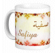 Mug avec le prénom "Farida" écrit en français, en arabe (فريدة) et calligraphié de façon artistique en arabe sur la partie droite.