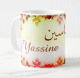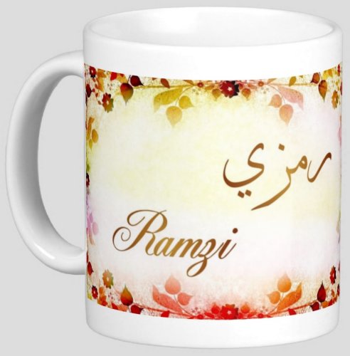 Mug avec le prénom "Ramzi" écrit en français, en arabe (رمزي) et calligraphié de façon artistique en arabe sur la partie droite.