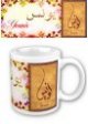 Mug avec le prénom "Rajia" écrit en français, en arabe (راجية) et calligraphié de façon artistique en arabe sur la partie droite.
