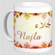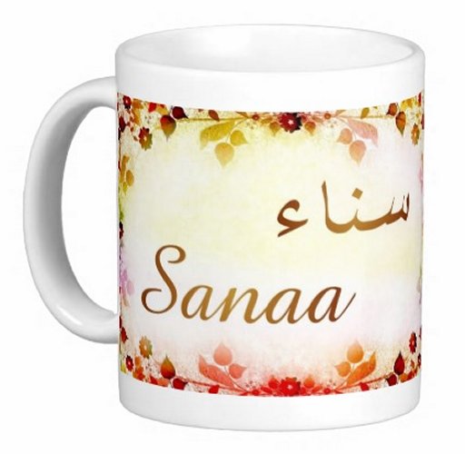 Mug avec le prénom "Sanaa" écrit en français, en arabe (سناء) et calligraphié de façon artistique en arabe sur la partie droite.