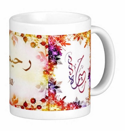 Mug avec le prénom "Rahima" écrit en français, en arabe (رحيمة) et calligraphié de façon artistique en arabe sur la partie droite.