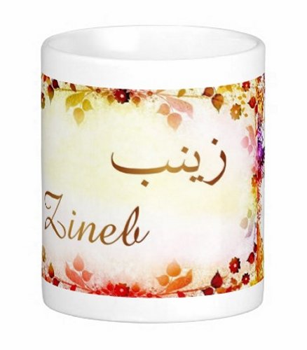 Mug avec le prénom "Zineb" écrit en français, en arabe (زينب) et calligraphié de façon artistique en arabe sur la partie droite.