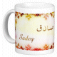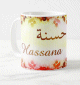 Mug avec le prénom "Syrine" écrit en français, en arabe (سيرين) et calligraphié de façon artistique en arabe sur la partie droite.