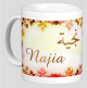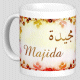Mug avec le prénom "Safiya" écrit en français, en arabe (صفية) et calligraphié de façon artistique en arabe sur la partie droite.