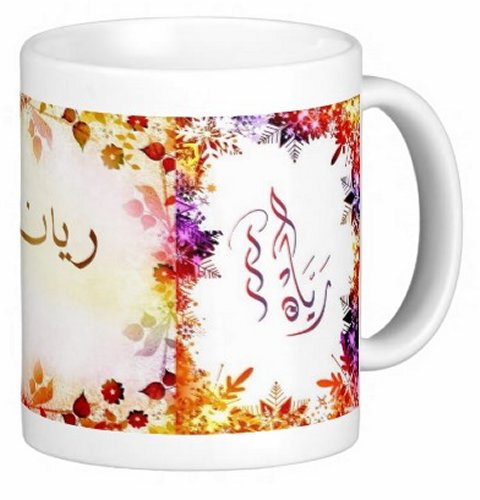 Mug avec le prénom "Rayyane" écrit en français, en arabe (ريان) et calligraphié de façon artistique en arabe sur la partie droite.