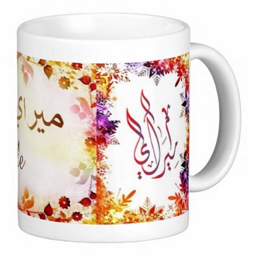 Mug avec le prénom "Mireille" écrit en français, en arabe (ميراي) et calligraphié de façon artistique en arabe sur la partie droite.