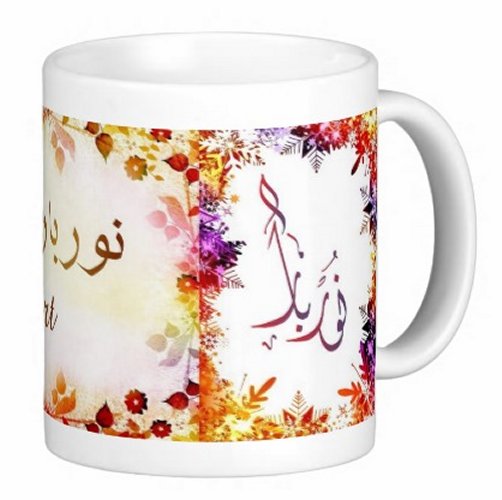 Mug avec le prénom "Norbert" écrit en français, en arabe (نوربار) et calligraphié de façon artistique en arabe sur la partie droite.