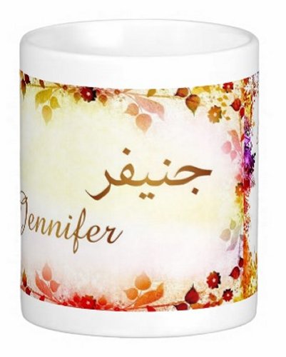 Mug avec le prénom "Jennifer" écrit en français, en arabe (جنيفر) et calligraphié de façon artistique en arabe sur la partie droite.