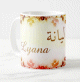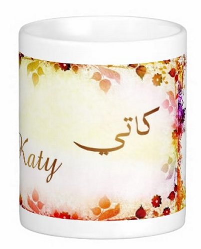Mug avec le prénom "Katy" écrit en français, en arabe (كاتي) et calligraphié de façon artistique en arabe sur la partie droite.
