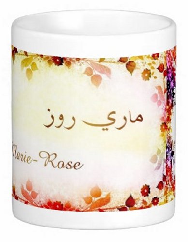 Mug avec le prénom "Marie-Rose" écrit en français, en arabe (ماري روز) et calligraphié de façon artistique en arabe sur la partie droite.