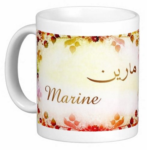 Mug avec le prénom "Marine" écrit en français, en arabe (مارين) et calligraphié de façon artistique en arabe sur la partie droite.