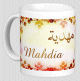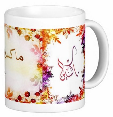 Mug avec le prénom "Maxine" écrit en français, en arabe (ماكسين) et calligraphié de façon artistique en arabe sur la partie droite.