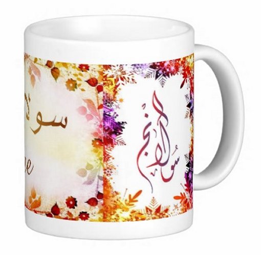 Mug avec le prénom "Solange" écrit en français, en arabe (سولانج) et calligraphié de façon artistique en arabe sur la partie droite.