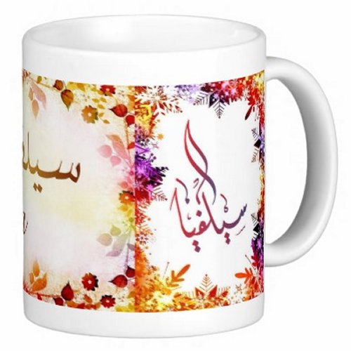 Mug avec le prénom "Sylvia" écrit en français, en arabe (سيلفيا) et calligraphié de façon artistique en arabe sur la partie droite.