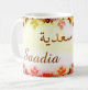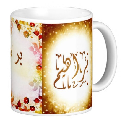 Mug avec le prénom "Brahim" écrit en français, en arabe (براهيم) et calligraphié de façon artistique en arabe sur la partie droite.