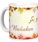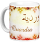 Mug avec le prénom "Hiba" écrit en français, en arabe (هبة) et calligraphié de façon artistique en arabe sur la partie droite.