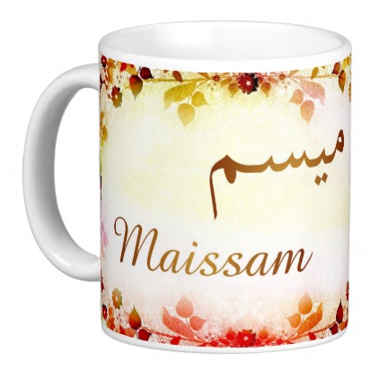 Mug avec le prénom "Maissam" écrit en français, en arabe (ميسم) et calligraphié de façon artistique en arabe sur la partie droite.