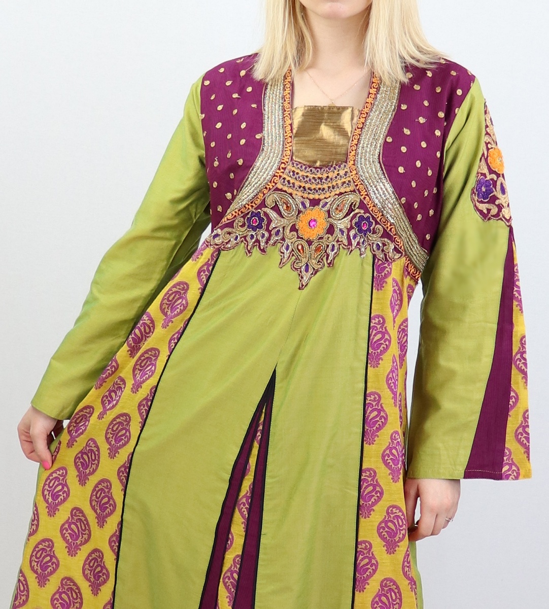 Regardez cette robe de plus près et voyez comment elle a été détaillée pour vous contenter. Elle se dessine tout en légèreté et dispose de très jolies finissions. Les couleurs verte, violette et dorée ont été soigneusement choisies pour une totale harmonie.