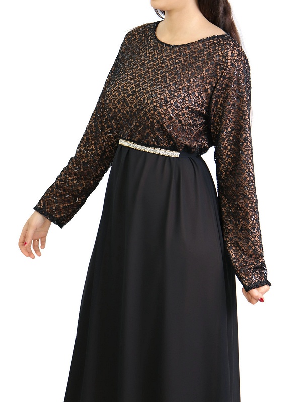Robe longue évasée de couleur Noire, pailletée sur la partie haute? entièrement doublée (de couleur marron). La partie basse est faite en mousseline. Livrée avec sa ceinture assortie décorée de strass argentés et de chaines dorées.