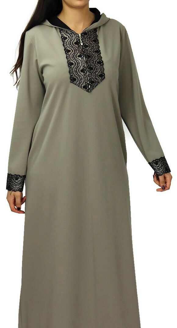 Abaya toute saisons avec capuche et ouverture zip au niveau du cou. Jolis motifs dorés au niveau de la poitrine et des manches, deux poches pratiques et discrètes sur les côtés. Tissu épais (non transparent) et fluide (élastique).