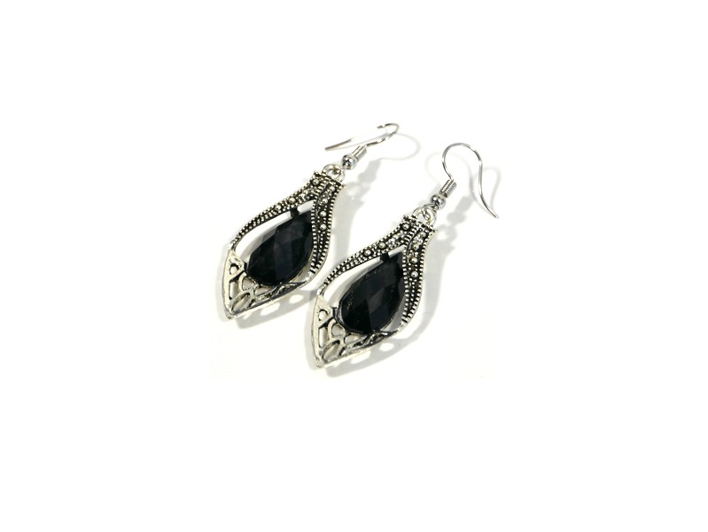 Boucles d'oreilles pendantes en métal argenté ciselé serties de pierres noir - REF. 29577 (5.90 €)