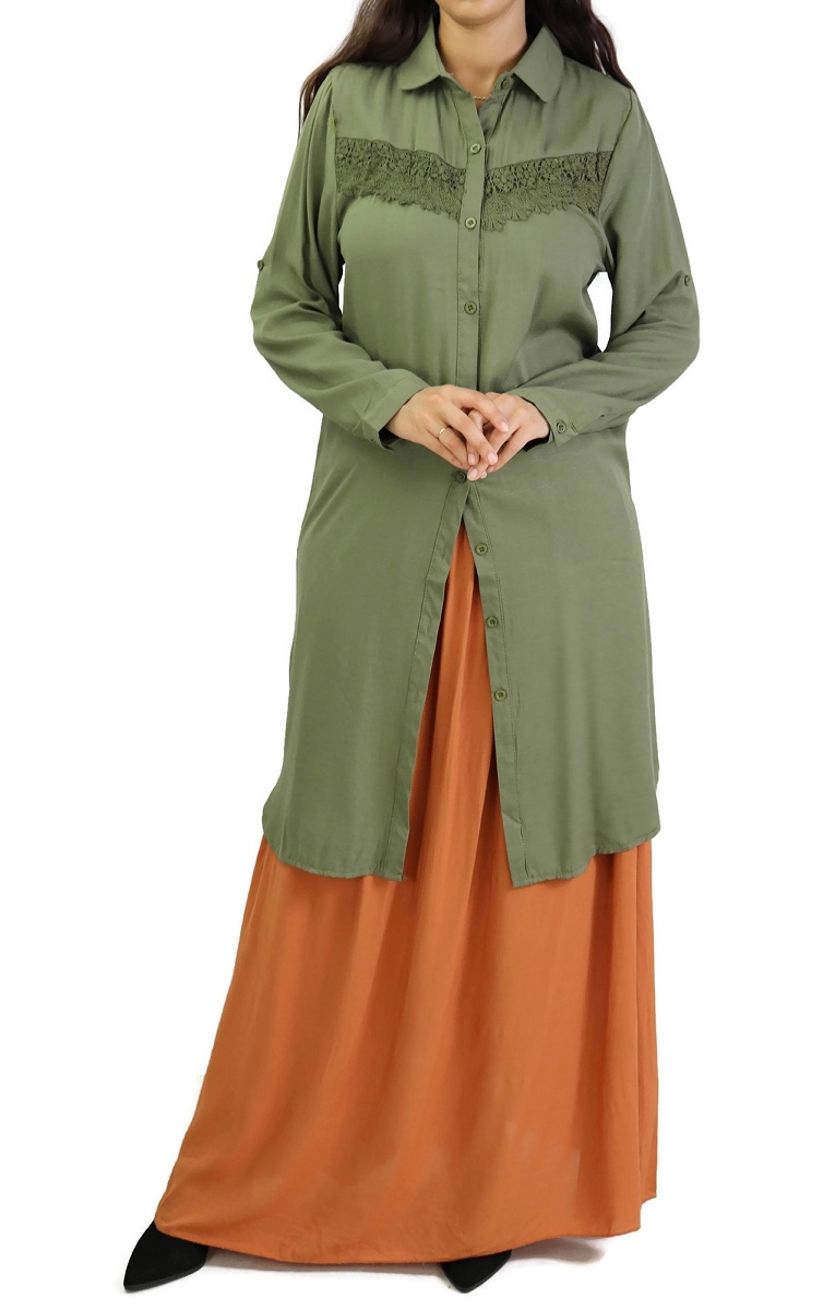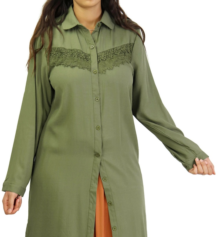 Chemise longue avec petites dentelles sur le devant. Les manches sont retroussables se replie grâce à une patte de boutonnage cousue à l’intérieur des manches, vous pouvez les retrousser en un clin d’œil et transformer ainsi votre chemise à manches longues en chemise à manches courtes.