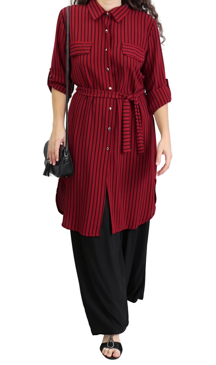 Chemise longue, manches ajustables, fermeture boutons, deux fausses poches plaquées, ceinture assortie, tissu effet crêpe, coupe droite.