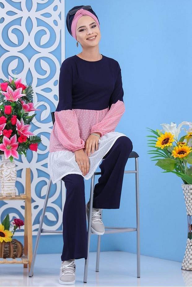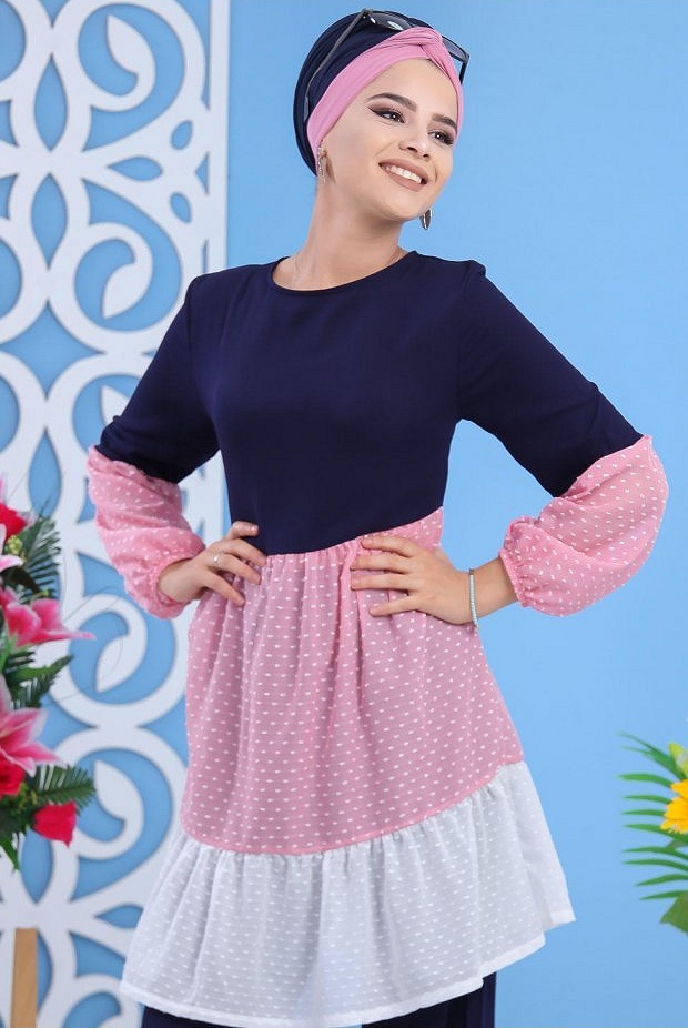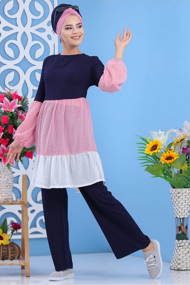 Ensemble 2 pièces : Tunique longue, col rond fermeture bouton, manches légèrement bouffantes, volants, coupe évasée ; et son pantalon assorti ample, coupe droite, taille élastique. Mélange de matières. Cet ensemble sobre et élégant n'a besoin de rien d'autre pour être mis en valeur.