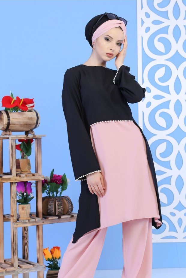 Ensemble 2 pièces : tunique longue, col arrondi, fermeture zippée au dos, manches légèrement évasées et perlées ainsi qu'au niveau de la taille ; Pantalon taille élastique, coupe ample.