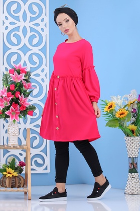 Tunique longue, col rond, manches bouffantes finition élastiques au niveau des poignets, taille cintrée et élastique, tissu effet crêpe. Ce modèle simple et classique vous conviendra car il s'assemble avec tout type de vêtements, les boutons d'ornement ajouteront un plus.