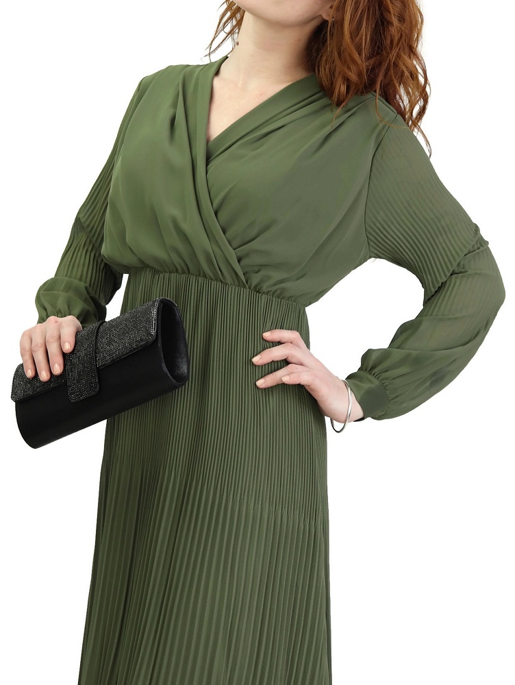 Robe longue, col cache cœur, taille élastique, manches finition boutons et effet plissées ainsi que le bas de la robe, entièrement doublée. Chic et élégante, vous n'avez rien à ajouter à votre tenue.