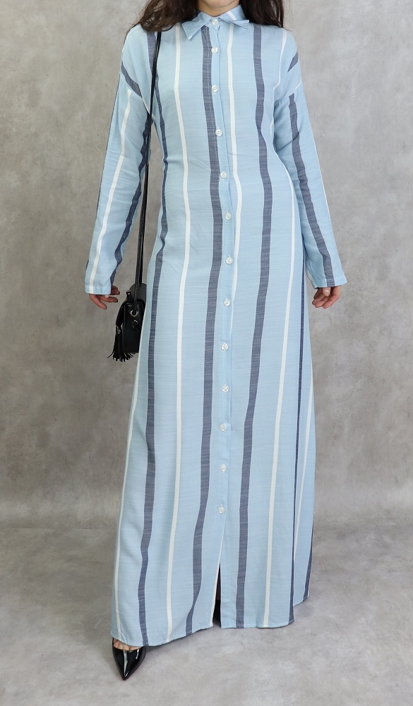 Robe longue, col chemise, ceinture à passants assortie, fermeture boutons, coupe légèrement évasée, tissu doux et léger.