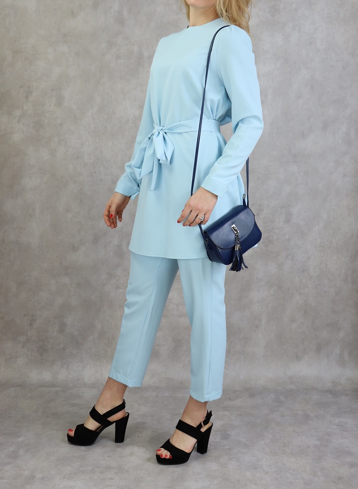 Ensemble 2 pièces. Tunique mi longue, col rond, fermeture bouton, manches finition bouton aux poignets, ceinture assortie, coupe evasée. Pantalon, taille élastique, 2 poches italiennes, coupe classique. Tissu doux, fluide et non transparent.