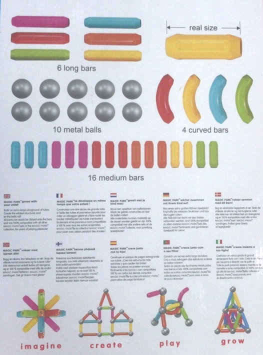 Composition : 36 pièces (voir photo du dos de l'emballage). Le jeu est livré avec un manuel et des vidéos de démonstration sur internet.