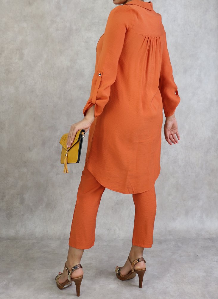 Tunique mi-longue, col avec lien de serrage, manches ajustables, 2 poches plaquées, tissu léger et fluide.