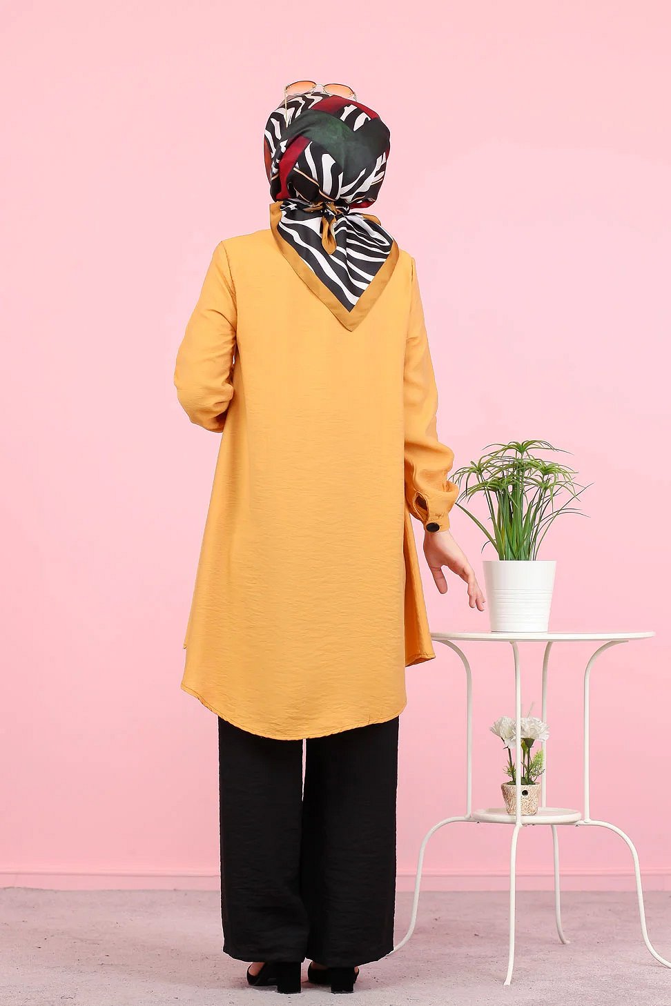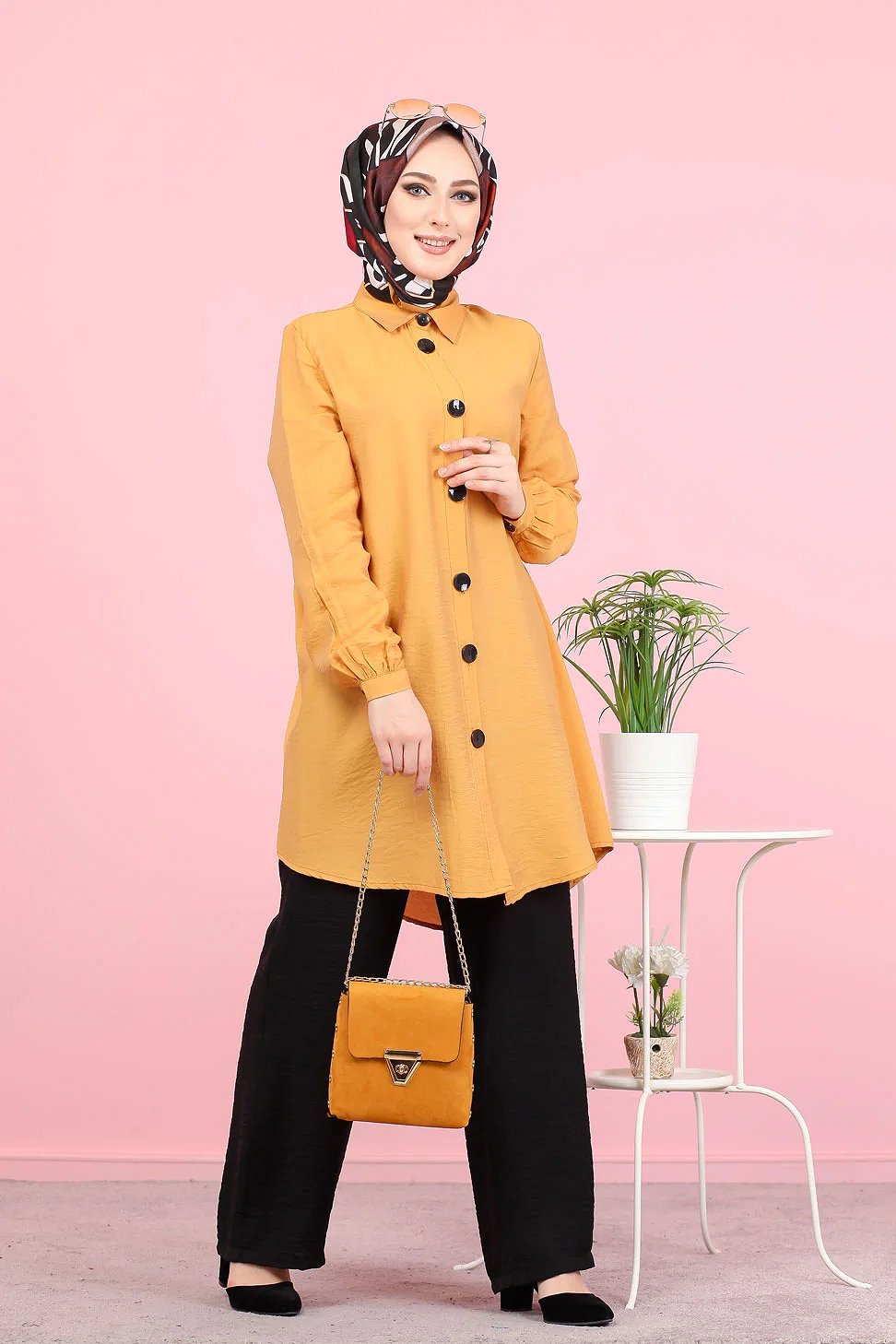 Tissu fluide, Col chemise. Manches longues avec poignets boutonnés, coupe évasée et ample. Fermeture boutonné sur le devant. Gros boutons.