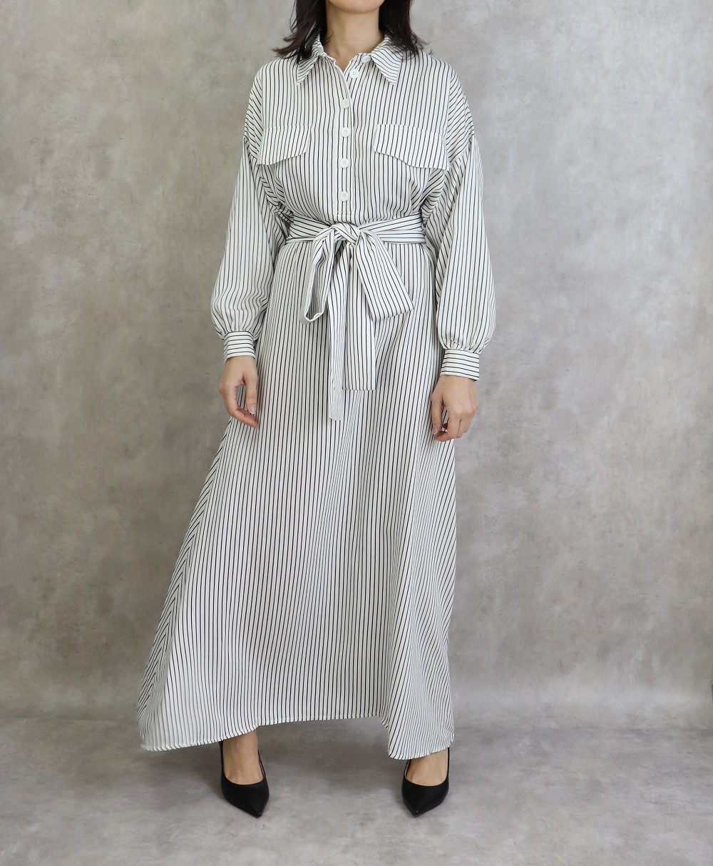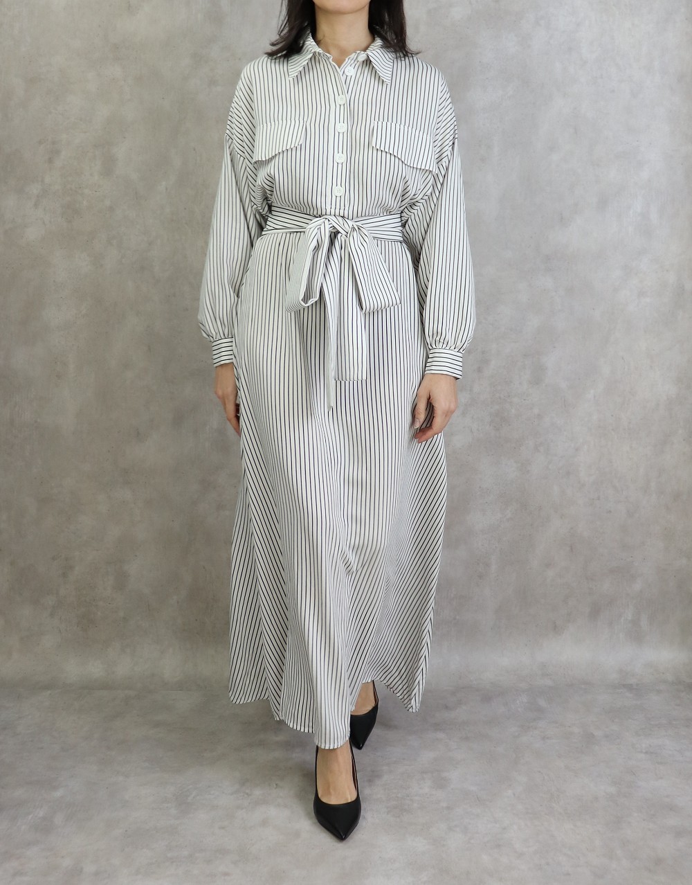 Robe longue, col chemise, fermeture bouton sur le buste; manches finition bouton aux poignets, 2 fausses poches à rabats, large ceinture assortie. Coupe évasée, tissu léger et fluide.