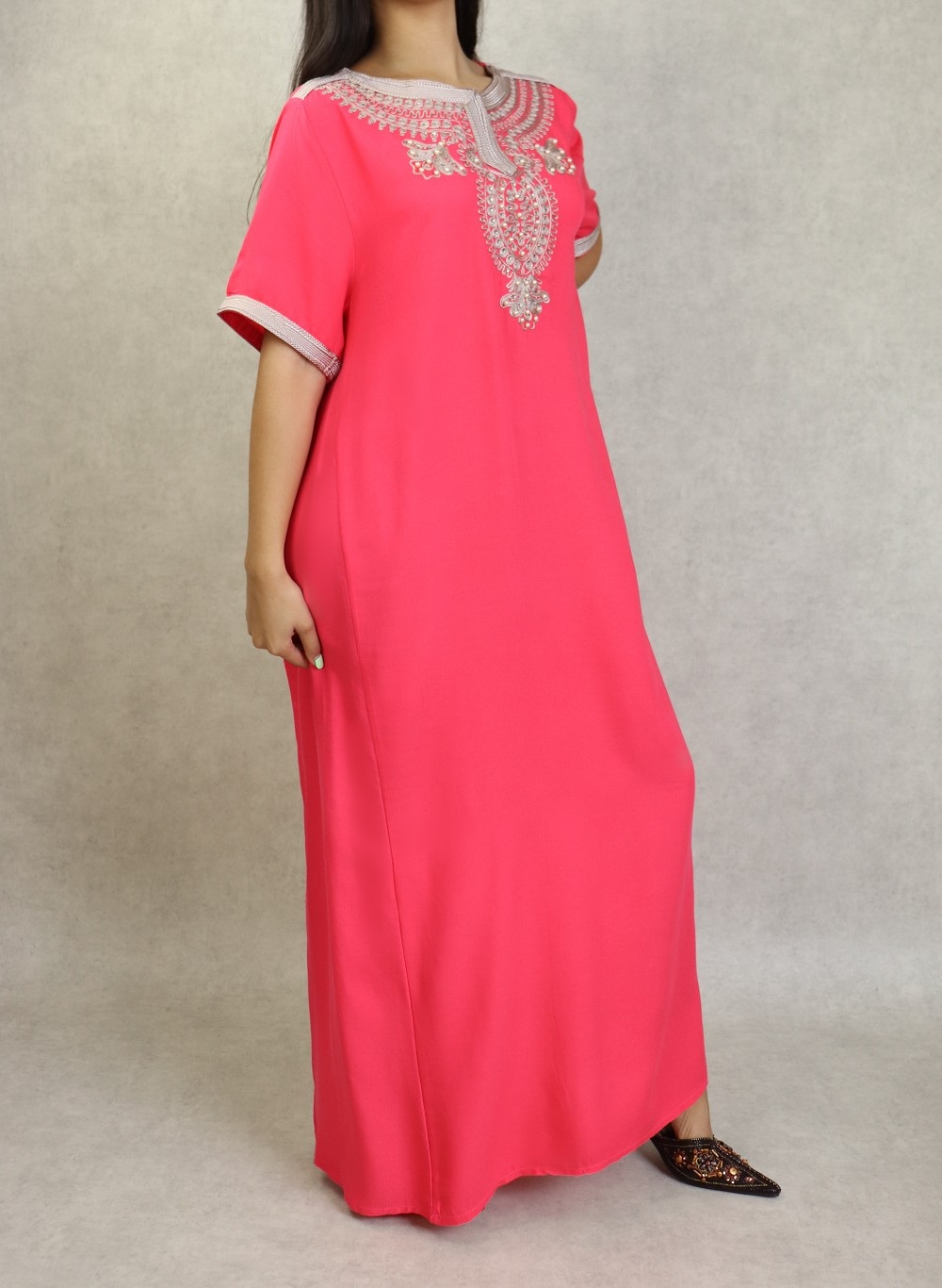 Cette robe orientale à manches courtes, encolure brodée et décorée de perles, tissu doux type coton et léger vous donnera une allure incroyable.