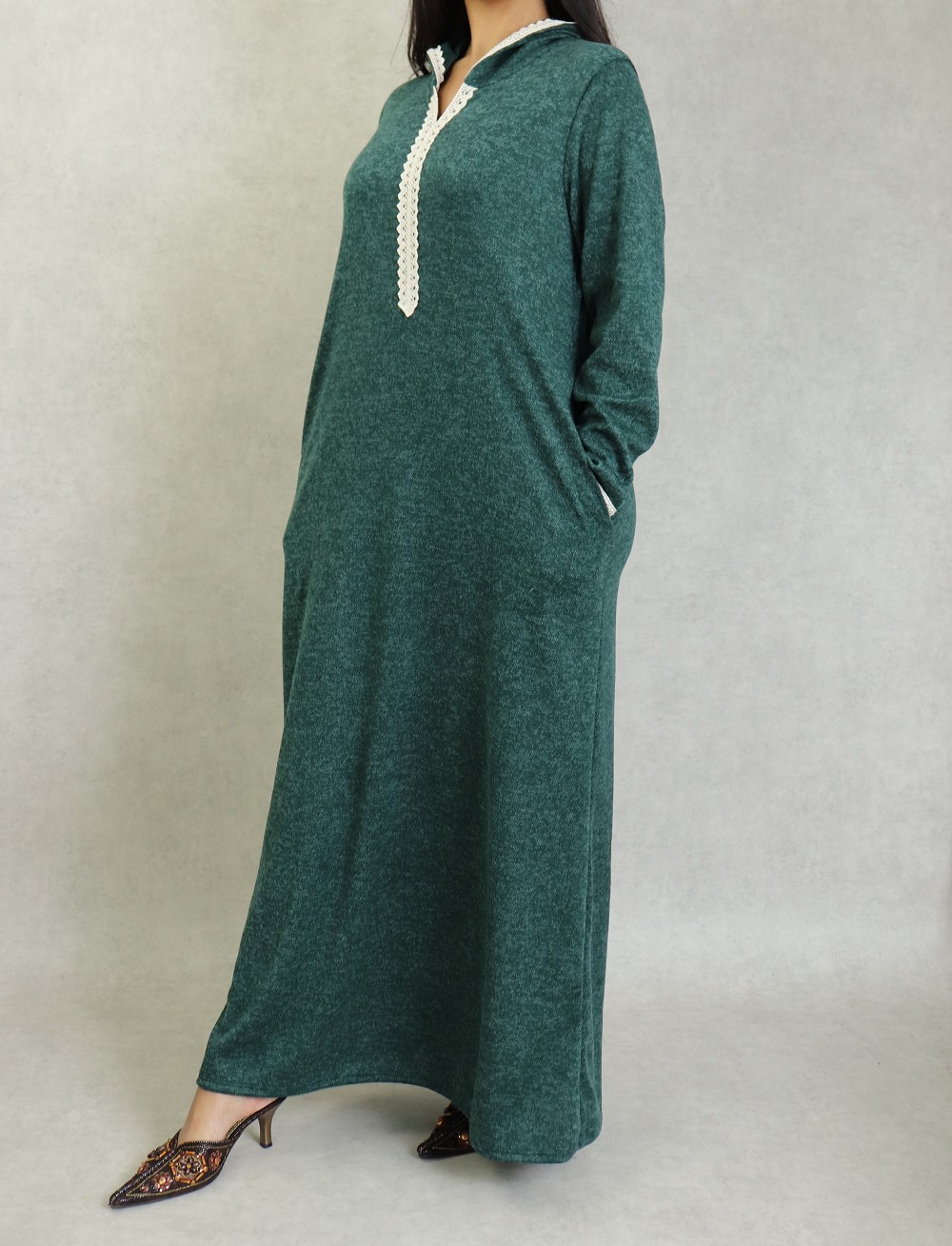 Djellaba style marocain de tissu épais effet chiné. avec dentelles beige sur le devant, sur les poignets ainsi que le contour de la capuche, 2 poches latérales pratiques pour ranger vos effets personnels.