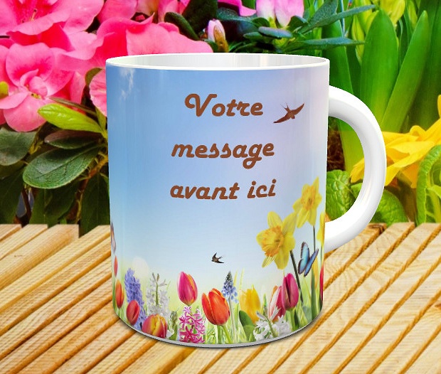 Tasse cadeau avec votre message (Faire un mug personnalise avec photo ciel, tulipes et papillon)