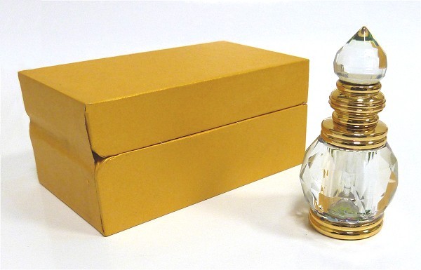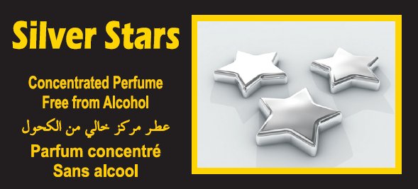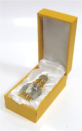 Parfum concentré sans alcool Musc d'Or "Silver Stars" pour hommes dans jolie bouteilles en cristal et métal doré. Avec sa boite cadeau jaune.