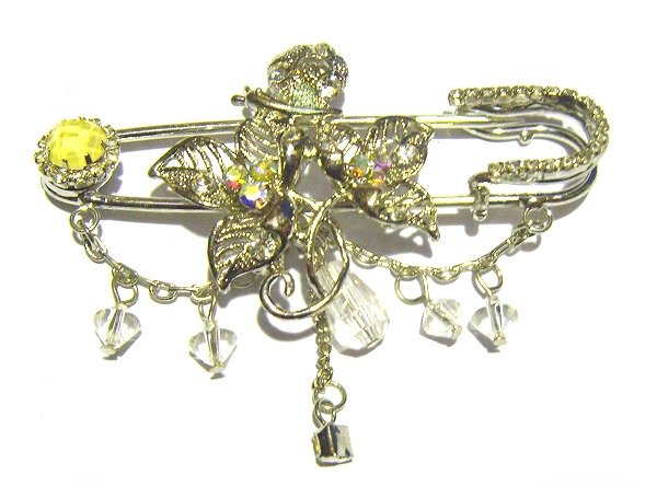 Grande épingle-broche dorée en forme de fleurs avec perles jaunes et blanches pour châle.